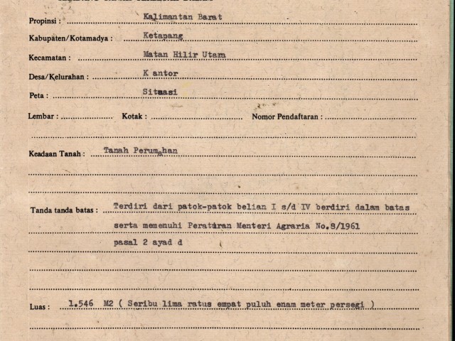 | Lokasi Tanah | : | Jalan Merdeka Kecamatan Delta Pawan |
